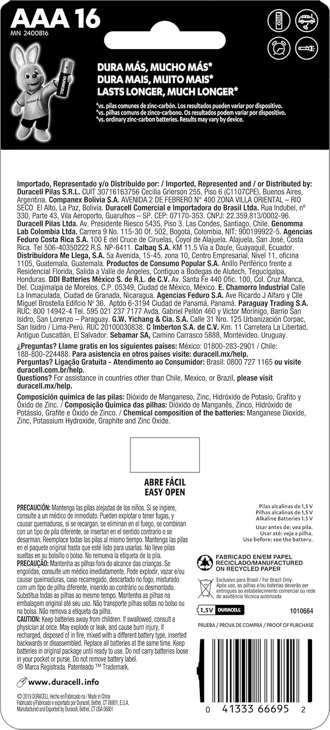 Duracell Pilha Alcalina AAA Palito Com 16 Unidades – Dura Mais – Ideal para Controles Remotos, Brinquedos e Lanternas