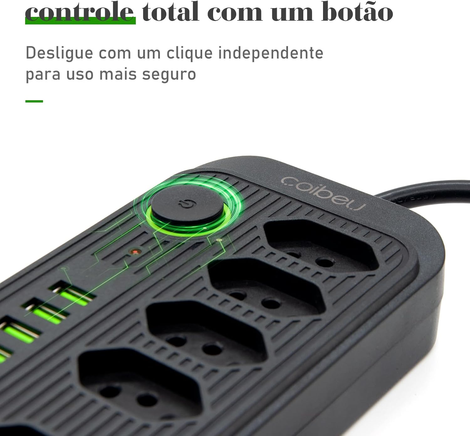 Extensão Tomada, Régua Tomada, Régua de Energia, 5 Tomadas, 4 Interfaces USB, 1 Porta USB Tipo-C, Cabo de Alimentação de 1,9 metros, Suporte a Tensão de 110-220V, Potência de 2500W (Preto)